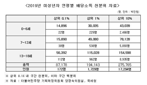 국회 기획재정위원회 소속 더불어민주당 양경숙 의원이 국세청으로부터 제출받은 ‘2019년 미성년자 연령별 배당소득 천분위 자료’를 분석한 결과, 이같이 밝혀졌다.