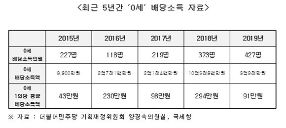 또한 태어나자마자 수익을 얻는 ‘0세’ 배당 소득자는 2019년 427명으로 나타났다. ▲2015년 227명 ▲2016년 118명 ▲2017년 219명 ▲2018년 373명으로 매년 늘어나고 있다.