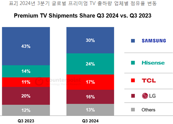 프리미엄 TV 모델 점유율이 여전히 삼성이 1위를 차지했다. 다만 1년 사이에 13%포인트 빠진 30%에 머물렀다는 점이다. 이 빠진 부분을 중국업체인 하이센스와 TCL은 전년 대비 두배 이상 많은 프리미엄 TV를 출하하며 LG를 4위로 밀어내고 각각 2, 3위를 차지했다.