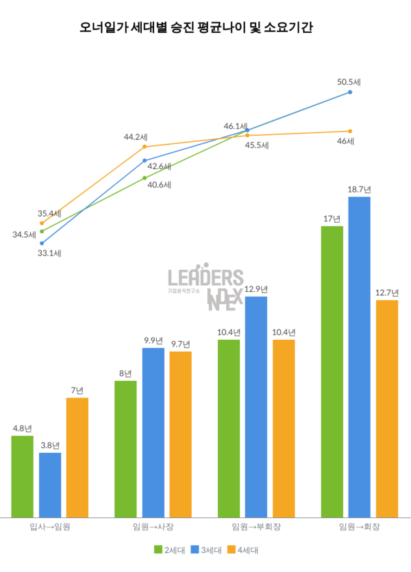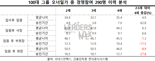임원에서 사장까지 승진하는 기간은 2세대 평균 8.3년에서 3세대 평균 9.9년으로 늘었다가 4세대는 소폭 줄어든 평균 9.7년으로 집계됐다. 그에 비해 임원에서 부회장까지 가는 기간은 4세대에서 확연이 짧아진 것이 확인됐다. 2세대는 부회장까지 평균 12.3년, 3세대는 평균 12.9년이 걸렸지만 4세대 들어서는 평균 10.4년으로 2년 이상 크게 줄었다.