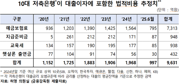 12일 국회 정무위원회 위원인 허영 더불어민주당 의원이 금융감독원으로부터 제출받은 자료에 따르면, 여신 규모 상위 10대 저축은행(SBI, 오케이, 한국투자, 애큐온, 웰컴, 다올, 신한, 하나, 페퍼, KB)가 2020년부터 올해 상반기까지 5년 6개월간 소비자 대출이자에 포함시킨 법적비용은 9631억 원에 달했다.